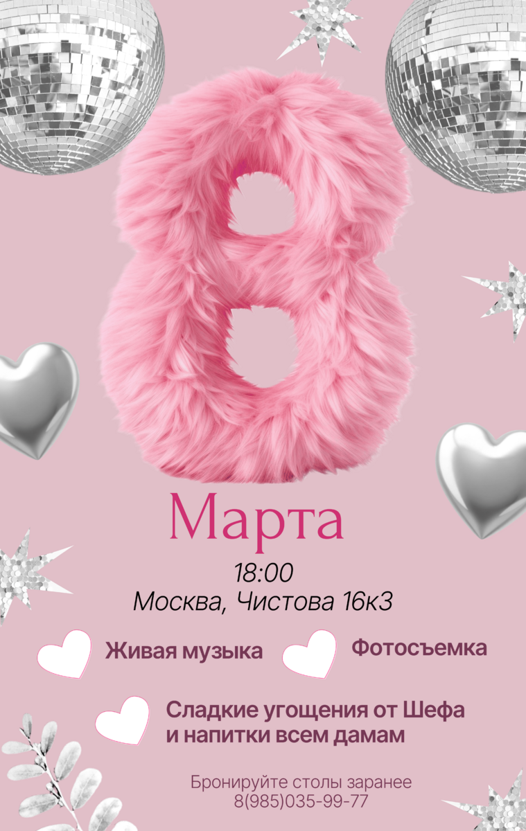 Забронируйте столик заранее — пусть этот день будет наполнен радостью, улыбками и весенним настроением!